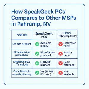 In a market where most Pahrump tech services focus on basic repairs, **SpeakGeek PCs** stands out by offering full cybersecurity, mobile device protection, and management services typically found only in bigger cities. You get local, on-site service paired with modern security tech—and personalized care.