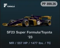 | Circuit Gilles-Villeneuve | Super Formula • SF19/SF23 • Racing Tires | 250,000cr | Super Formula SF23 Toyota ’23 (Garage) |